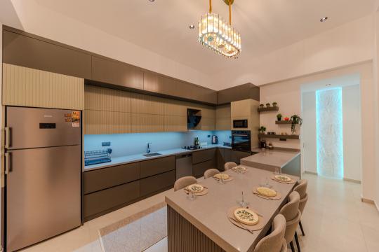 Amerikan mutfakta buzdolabi, bulasik makinasi, çamasir makinasi, firin, 4'lü ocak, mikrodalga firin, elektrikli su isitici (kettle), yemek masasi, yemek takimlari, çatal ve biçak takimlari, tencere ve tava takimlari, bardaklar bulunmaktadir.