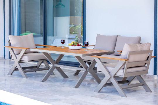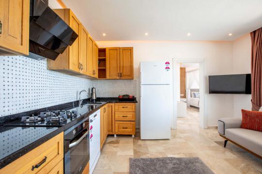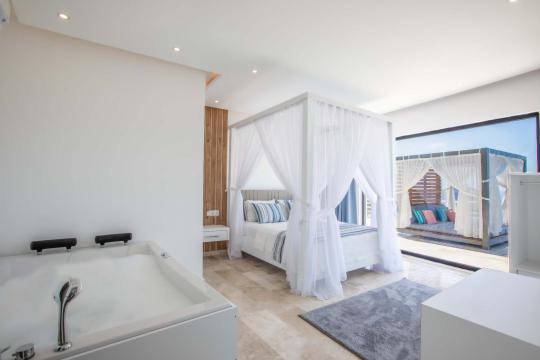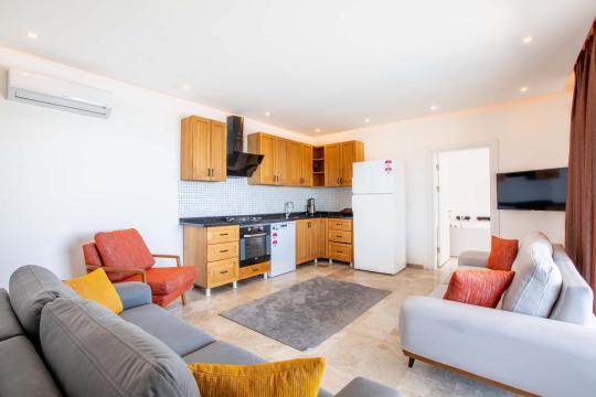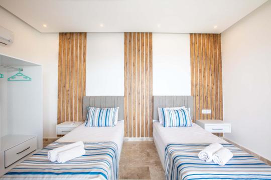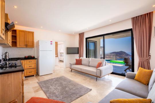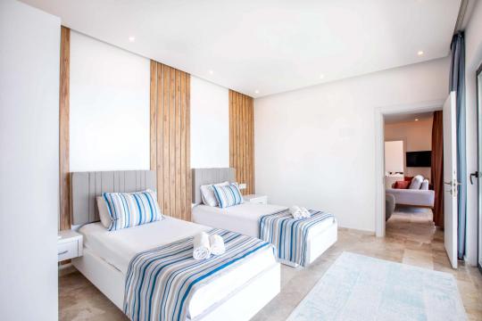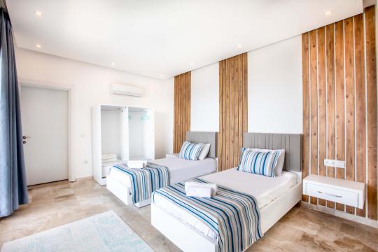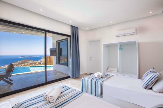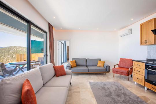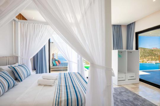 Lüks bir tasarıma sahip villa bünyesinde kapasiteye uygun mobilyalar, ihtiyacınız olan tüm araç-gereçleri barındıran Amerikan tarzda, modern mutfak ve 2 adet yatak odası mevcutur. Konforunuz odaklı tasarlanan villanın tüm yatak odalarında klima ve özel kullanım banyo/wc bulunmaktadır. Ebeveyn suit yatak odalarından birinde günün yorgunluğunu atmanızı ve tatilin keyfini çıkarmanızı sağlayacak 1 adet jakuzisi de bulunmaktadır. Villanın deniz manzarası gören havuz terasında yine kapasiteye uygun şezlong ve şemsiye, oturma alanı, yemek masası ve barbekü alanı bulunmaktadır.