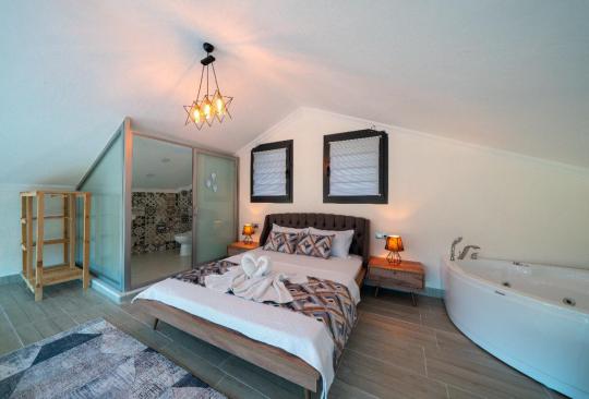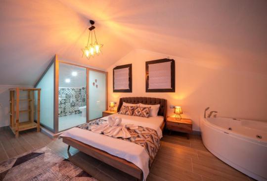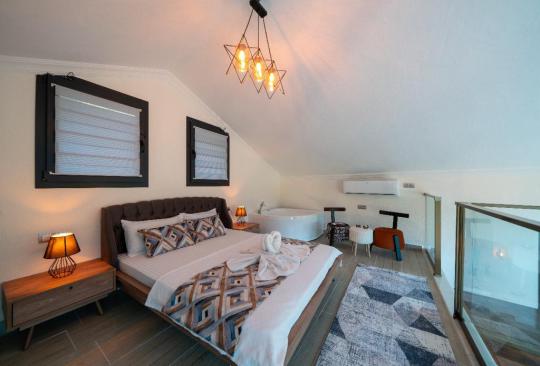 1.Yatak Odası :Çift kişilik yatak, komodin, klima, jakuzi ,tekli puf koltuk, klima, banyo ve WC bulunmaktadır. (asma katta yer almaktadır, kapı bulunmamaktadır)