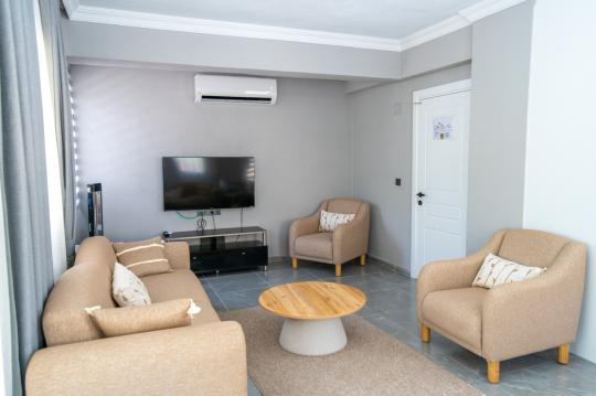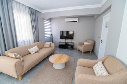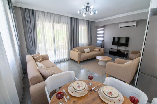 Salon :Zevkle tasarlanmış salonumuzda oturma grubu, TV, orta sehpa, klima, internet erişimi için wi-fi, havuz terasına çıkış bulunmaktadır.