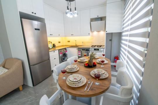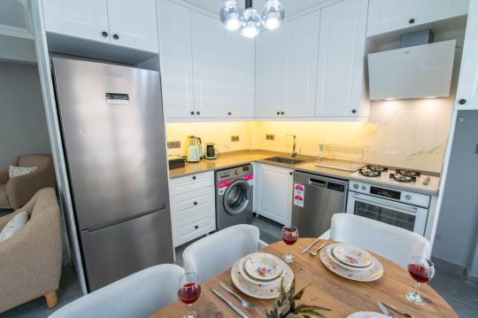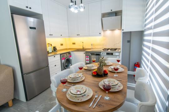Mutfak :Amerikan mutfak tarzında dizayn edilmiş mutfakta yemek masası ve sandalyeler, bulaşık makinası, çamaşır makinası, buzdolabı, fırın, kettle, ankastre 4'lü ocak ve aspiratör, çaycı, tabak, tencere, mutfak araç gereçleri vs. bulunmaktadır.