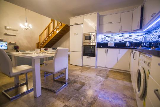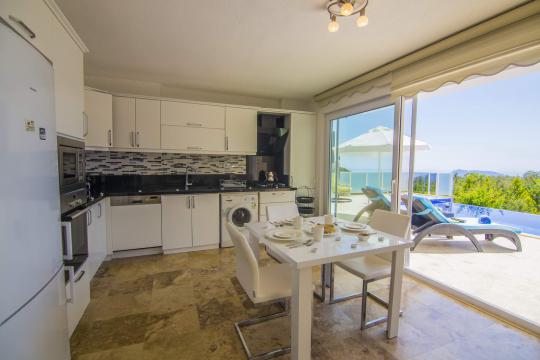 Mutfak: Amerikan mutfak tarzında dizayn edilmiş olan mutfak doğa manzaralı olup içerisinde mikrodalga fırın, bulaşık makinası, ankastre fırın, buzdolabı, çamaşır makinası, ankastre 4’lü ocak, elektrikli su ısıtıcı kettle, ekmek kızartma makinası, tost makinesi, tencere ve tava takımı, 4 kişilik yemek takımı, kaşık ve çatal seti ve bardaklar bulunmaktadır.