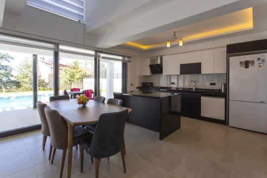 Mutfak : Modern Amerikan tarzı mutfağımızda buzdolabı, bulaşık makinesi, fırın, 4'lü ocak ve kettle bulunmaktadır. Ayrıca 8 kişilik yemek masası, yemek takımları, çatal bıçak setleri, tencere ve tava takımları ile bardaklar da mevcuttur.