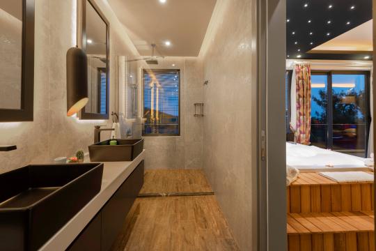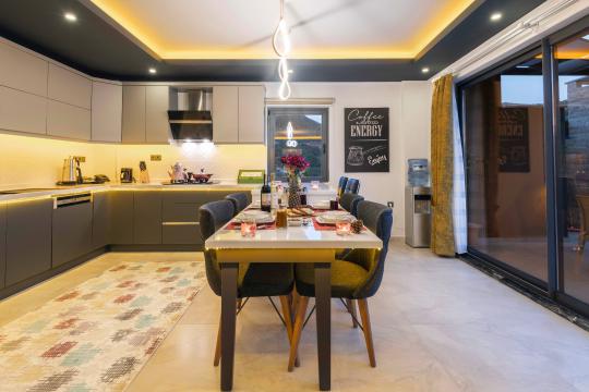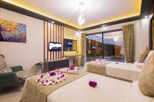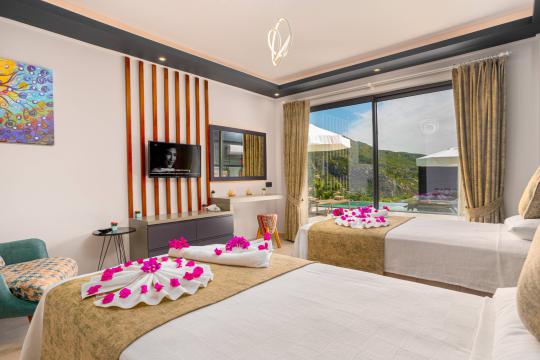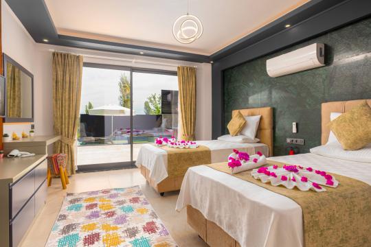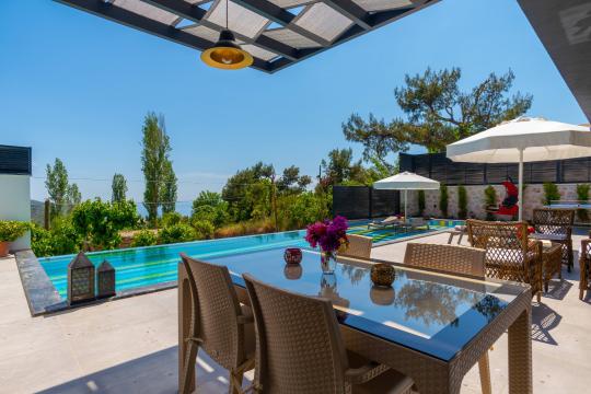 Doğa ve deniz manzaralı, Balayı çiftlerine uygun, Lüks iç ve dış dekarasyon,Oda içi jakuzi, Olimpik infinity havuz, Yatay havuz, Çocuk havuzu, Muhafazakar tatil, Modern iç ve dış eşyalar, Playstation, Masa tenisi, Her odada tv, Sinema odası, Koşu bandı, Tek ve Çift kişilik salıncak ve bina hırsızlık güvenliği için alarm bulunmaktadır.