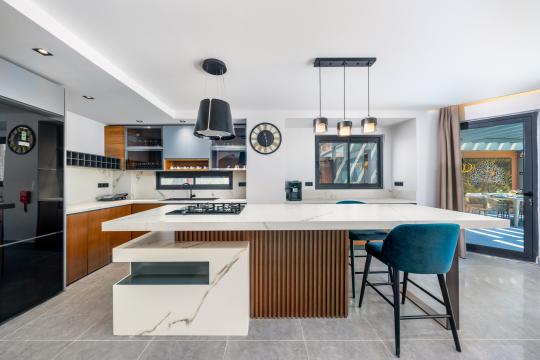 Mutfak: Villa Nova içerisinde deniz ve doğa manzaralı modern amerikan mutfak yer almaktadır.Mutfak içerisinde fırın, buzdolabı, bulaşık makinası, çamaşır makinası, elektrikli su ısıtıcı , 4’lü ocak, tencere ve tavalar, 8 kişilik yemek takımı, çatal ve bıçak takımı, çay, kahve, su bardakları bulunmaktadır.
