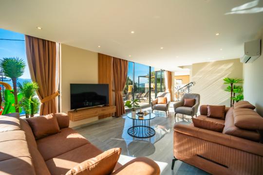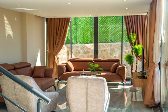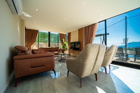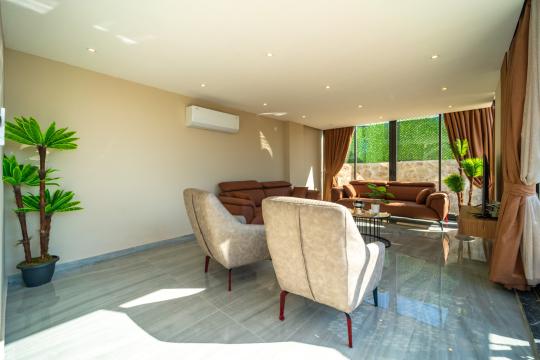 Oturma Odası: Salon modern mobilyalarla dekore edilmiş olup rahat L şeklinde bir koltuk, TV, TV ünitesi, DVD oynatıcı, uydu alıcısı, klima ve internet bulunmaktadır. Oturma odasından havuz terasına bir geçit bulunmaktadır.