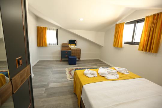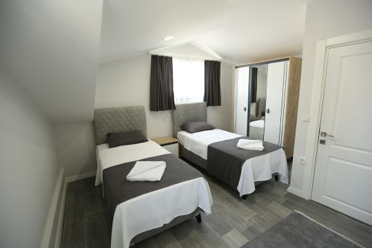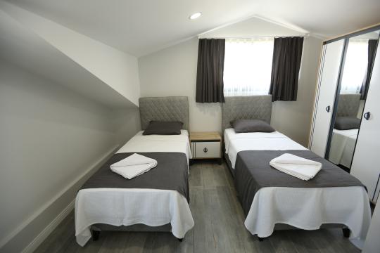 3. Yatak Odası 2 tek kişilik yatak + komodin + elbise dolabı + makyaj masası + klima + ortak banyo