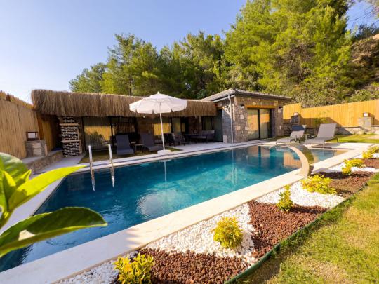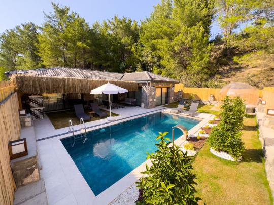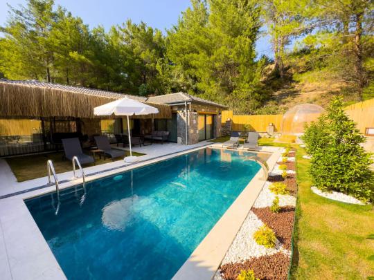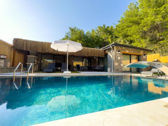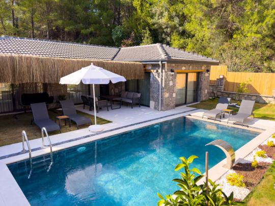 Seydikemer Belen mevkiinde doğa içerisinde konumlu 2 yatak odası bulunan 4 kişi konaklama kapasitesine sahip özel havuzlu ve jakuzili kiralık tatil villamızdır. Villamızın havuz terası korunaklı olup balayı çiftleri ve çekirdek ailelerin konaklamasına uygundur.
