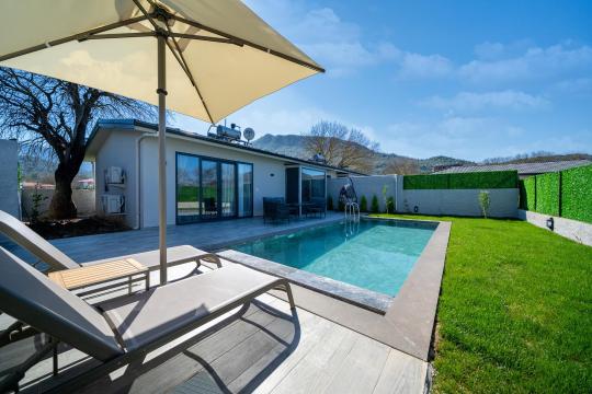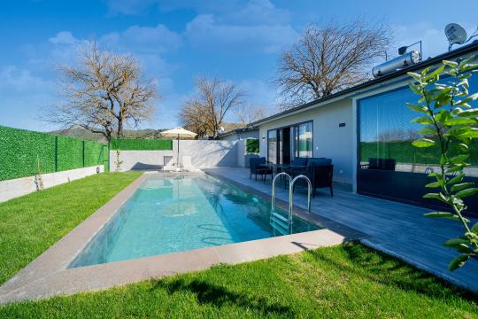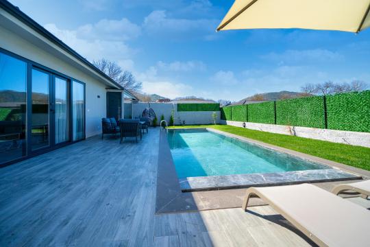 Villanın iç ve dış mekanı oldukça modern tasarlanmış olup havuz alanı korunaklıdır. Mahremiyetine önem veren misafirlerimiz için oldukça doğru bir tercihtir. Ebeveyn yatak odasında bulunan jakuzi ile doğa manzarası eşliğinde tüm yıl beklediğiniz keyfi yaşayabilirsiniz.