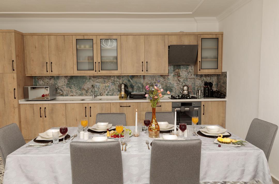 Mutfak : Havuz katında bulunan Amerikan mutfakta buzdolabı, bulaşık makinesi, çamaşır makinesi, yemek masası, fırın, 4’lü ocak, tost makinesi, kettle, yemek takımı, tava, tencereler ve çatal bıçak takımı bulunmaktadır.