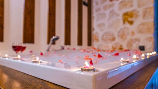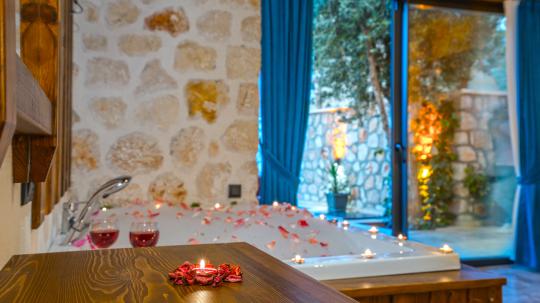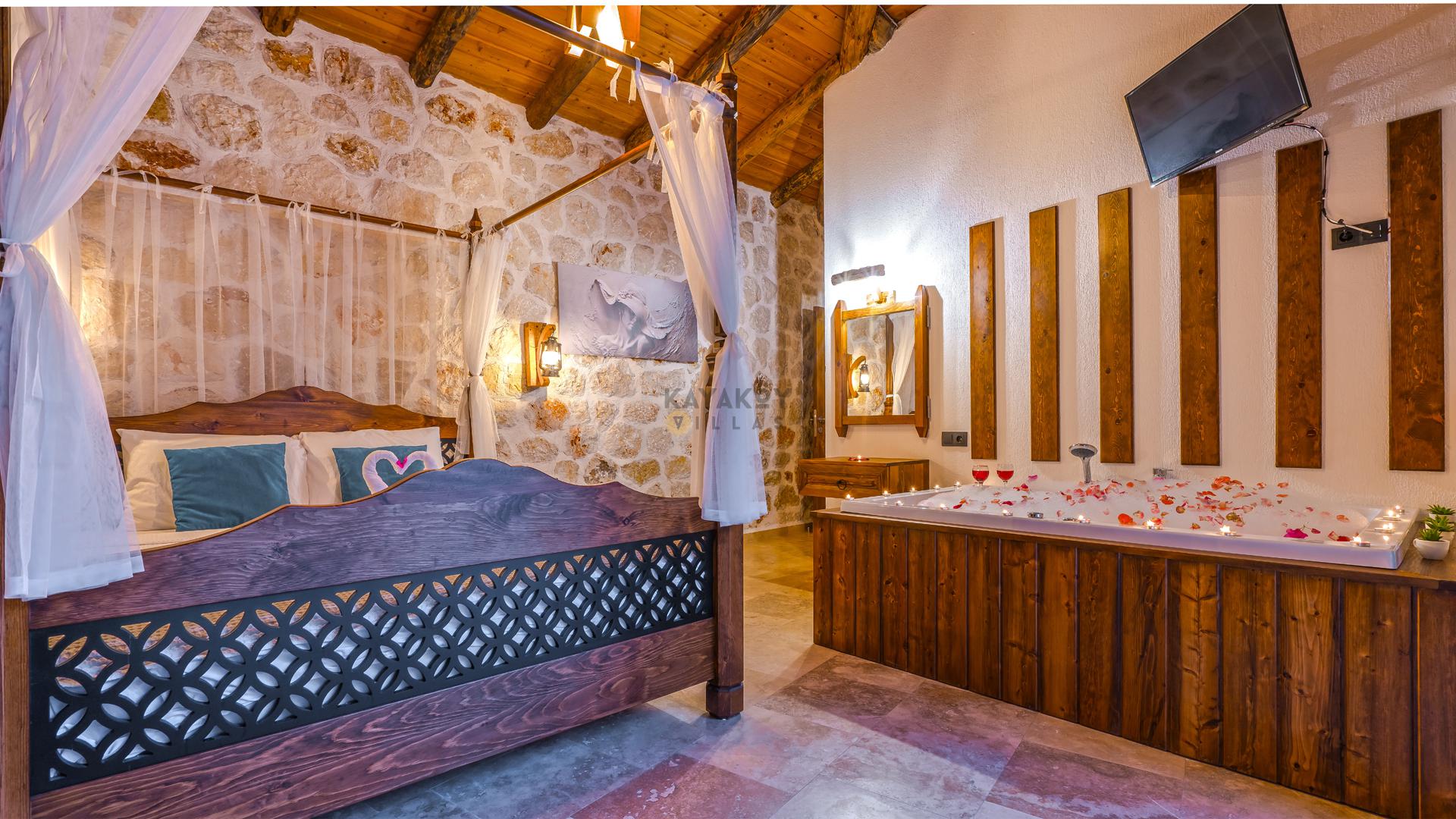 Villamızın birinci yatak odasında çift kişilik yatak, ebeveyn banyosu,jakuzi;