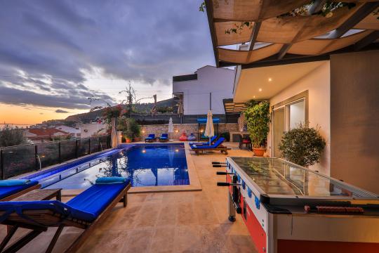 Havuz ve Bahçe : Özel yüzme havuzu ve bahçeye sahip Villa Melisa geniş güneşlenme alanı bulunmaktadır. 6 adet şezlong ve şemsiye, 6 kişilik yemek masası, oturma grubu, barbekü