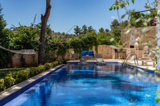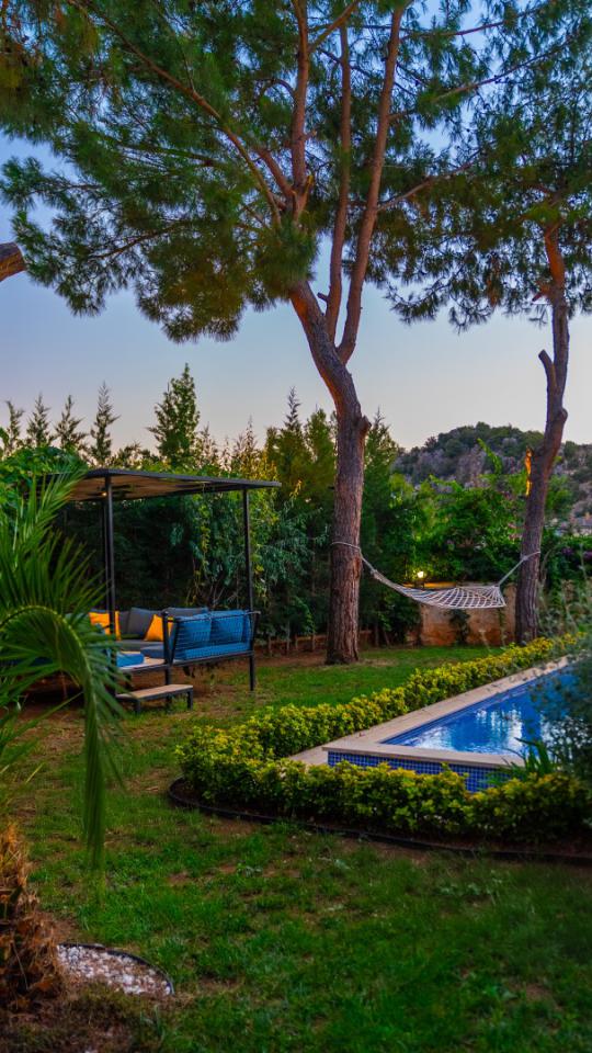Özel yüzme havuzu, Şezlonglar, bahçe oturma grubu, hamak, köşk, yemek masası ve sandalyeleri bulunur.