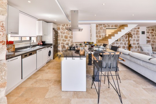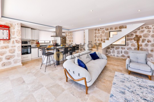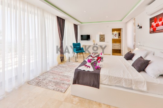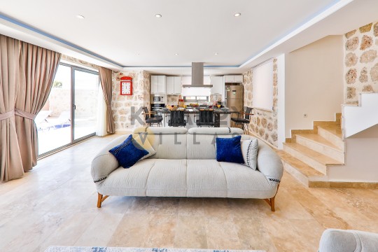 Villanın iç mekânı modern ve işlevsel şekilde düzenlenmiştir. Her odada klima ve konfor detayları bulunur; salon kısmında oturma grubu, TV ve yemek alanı gibi yaşam alanları yer alır. Mutfak tamamen donanımlı olup buzdolabı, ankastre fırın-ocak, bulaşık ve çamaşır makineleri, mikrodalga ve gerekli mutfak ekipmanları ile tatil süresince ev konforu sağlar. Villa genelinde yüksek standartlı mobilyalar ve dekorasyon ile ferah bir yaşam alanı sunulur.
