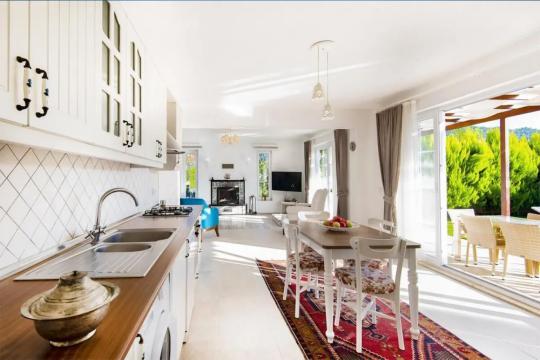 Mutfak : Havuz katında bulunan Amerikan mutfakta buzdolabı, bulaşık makinesi, çamaşır makinesi, yemek masası, fırın, 4’lü ocak, mikrodalga fırın, tost makinesi, ekmek kızartma makinesi, kettle, 6 kişilik yemek takımı, tava, tencereler ve çatal bıçak takımı bulunmaktadır.