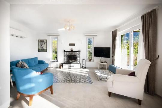 Salon : Oturma grubu, uydu alıcısı, TV, klima, lavabo, ütü, ütü masası, şömine, elektrik süpürgesi.