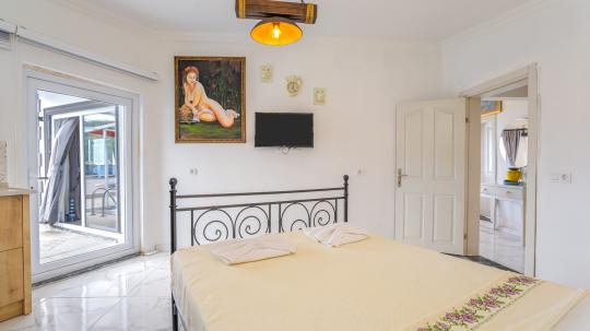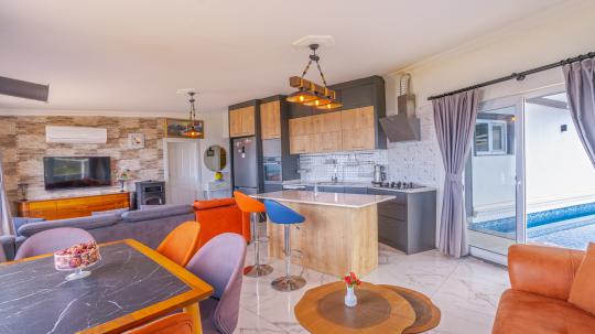 Salon : Salonumuzda oturma grubu, klima, LCD TV, sehpa, uydu alıcı bulunmaktadır. Havuz terasına çıkış yapılabilmektedir.