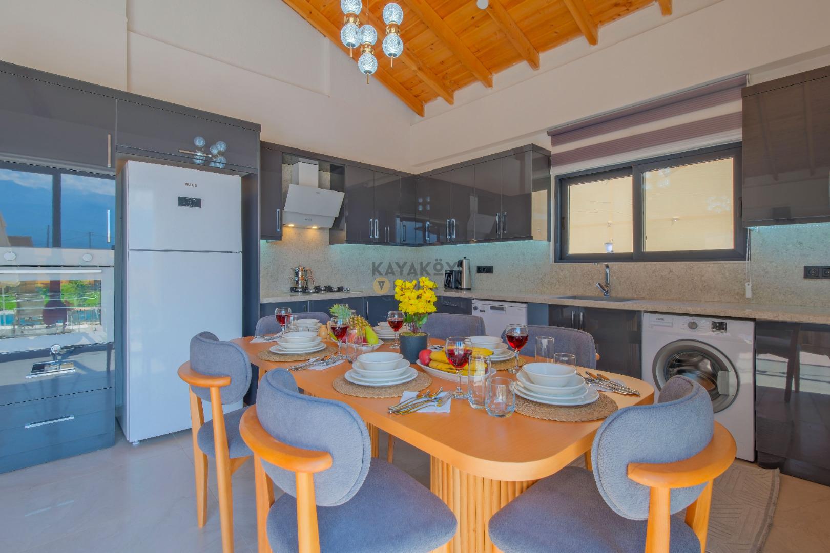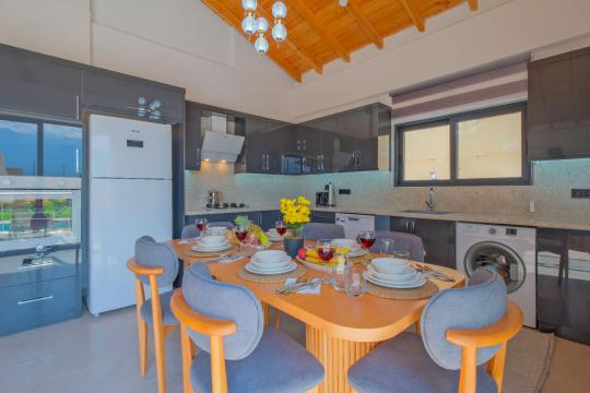 Mutfak: Açık planlı mutfak, 8 kişi ve daha fazla kişiye yetecek kadar mutfak malzemeleri, bulaşık makinesi, çamaşır makinesi, fırın, ocak, buzdolabı, mikrodalga fırın, çay makinesi, türk kahvesi makinesi, çaydanlık ve kettle bulunmaktadır.