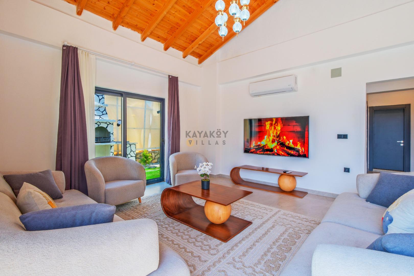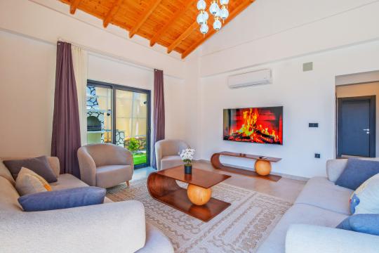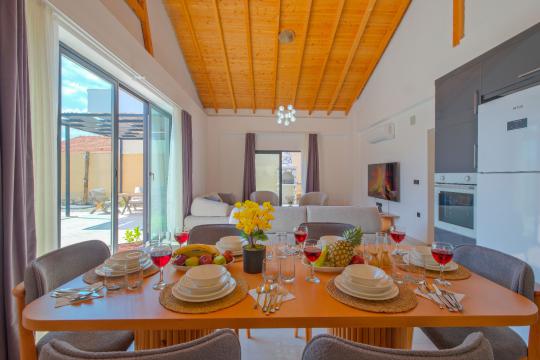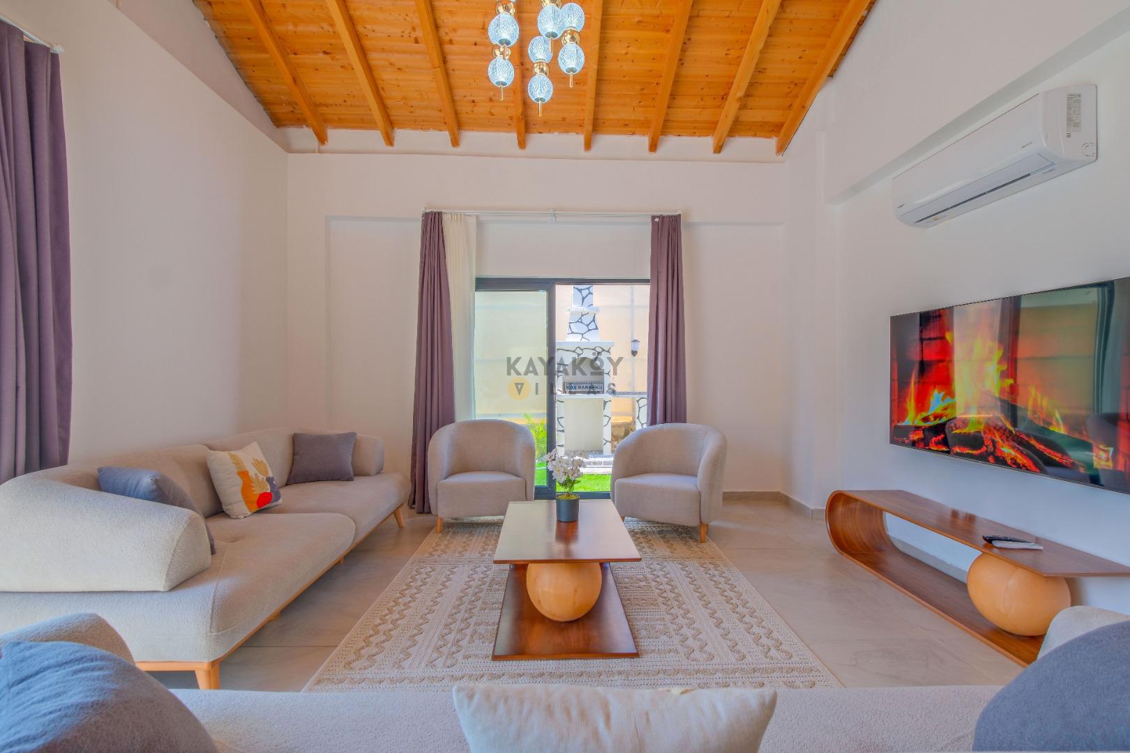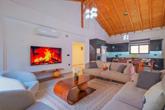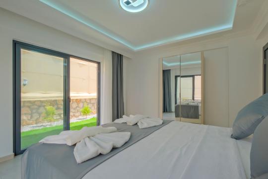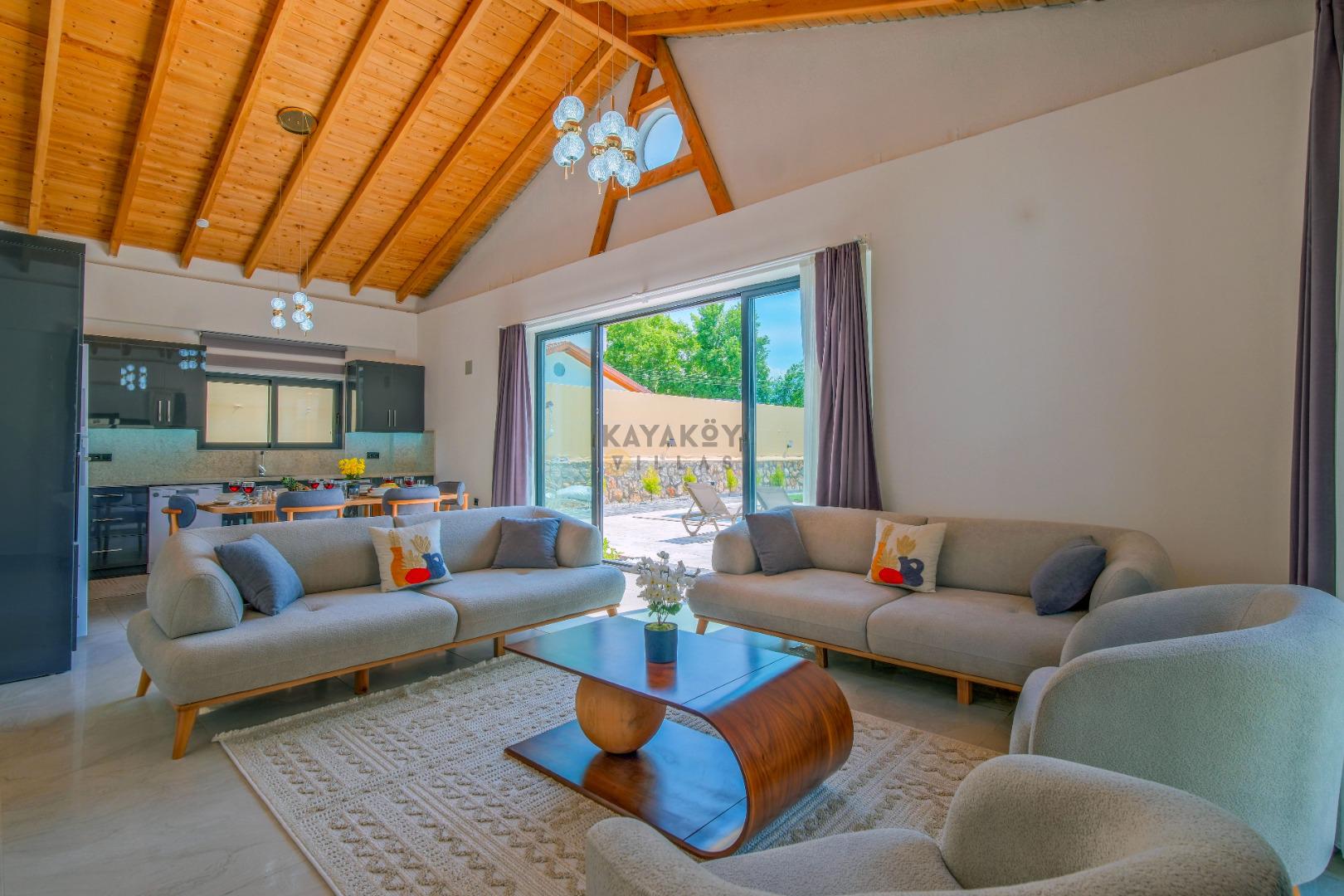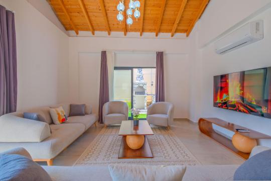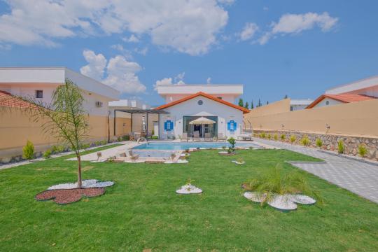 Salon: Özenle döşenmiş açık mutfaklı salon, klima, modern koltuklar, 8 kişilik yemek masası, Led tv, uydu alıcısı, havuz ve bahçeye açılan kapısı bulunmaktadır.