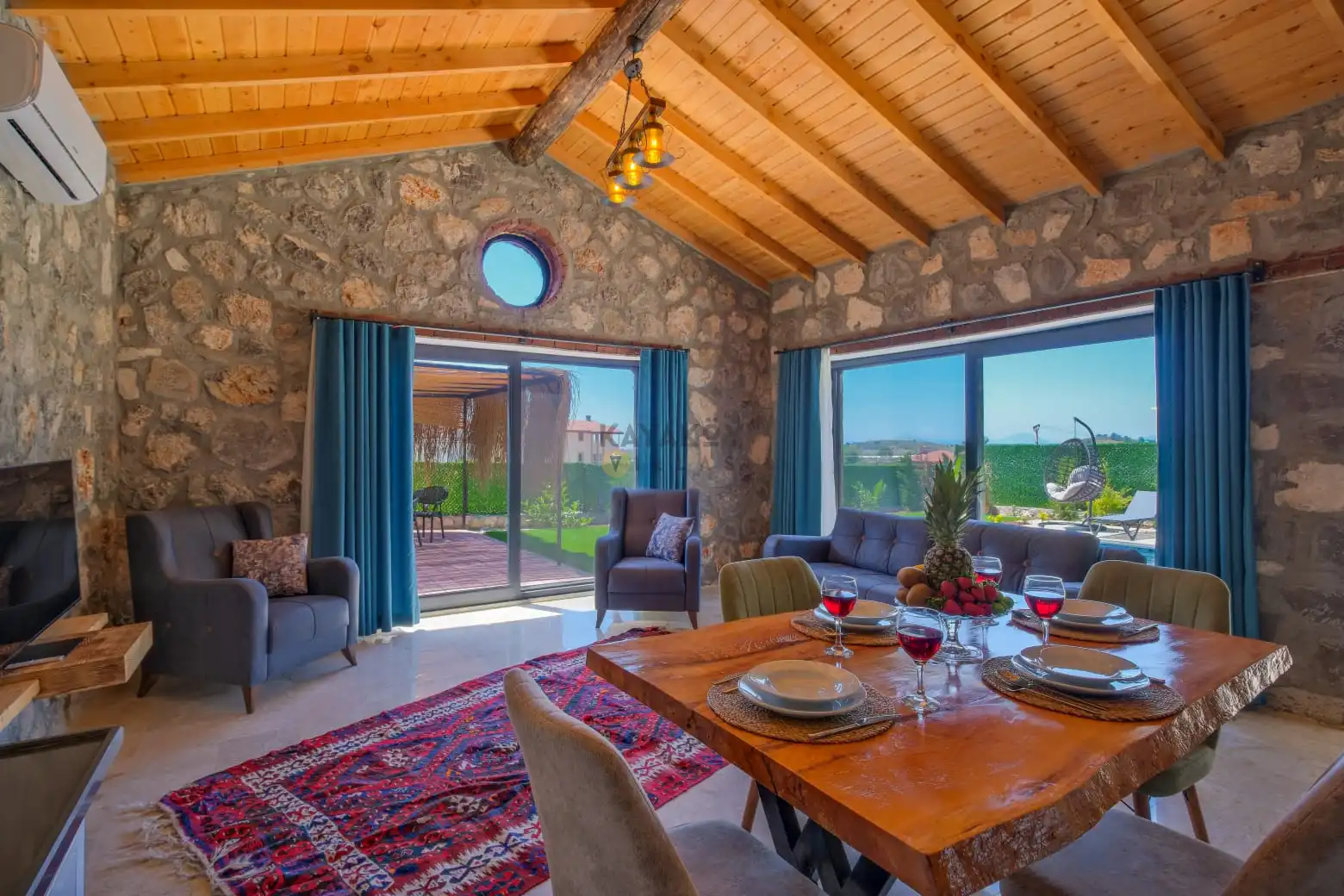 Villamız Fethiye’nin merkezi ve doğa içerisinde ki konumuyla bilinen Karagedik Mevkiinde yer almaktadır. Çalış plajı , Akmaz Koyu gibi plajlara yakınlığı ve evinize çekildiğinizde size yaşattığı sonsuz huzurla konaklayanlarına sıradışı bir deneyimi yaşatmaktadır.Villa Safran 2, 2 yatak odalı 4 kişilik kapasiteye sahip villa seçeneklerimiz arasında yer almaktadır. Villanın birer banyosu ve jakuzisi mevcut. Açık mutfağı ve kendine ait bahçesinde bir havuzu var. Mutfağında bulaşık makinesi, buzdolabı, ankastre fırın, tost makinesi ve mutfakta ihtiyaç olan hemen hemen bütün gereçler bulunuyor. Barbekü, masa, sandalyeler, şezlonglar ve şemsiyeler bahçe keyfini sınırsız yaşamanıza imkan tanıyor. Salonunda oturma grubu, televizyon, eşyalar bulunurken, tüm odalar için ayrı klima imkanı var.