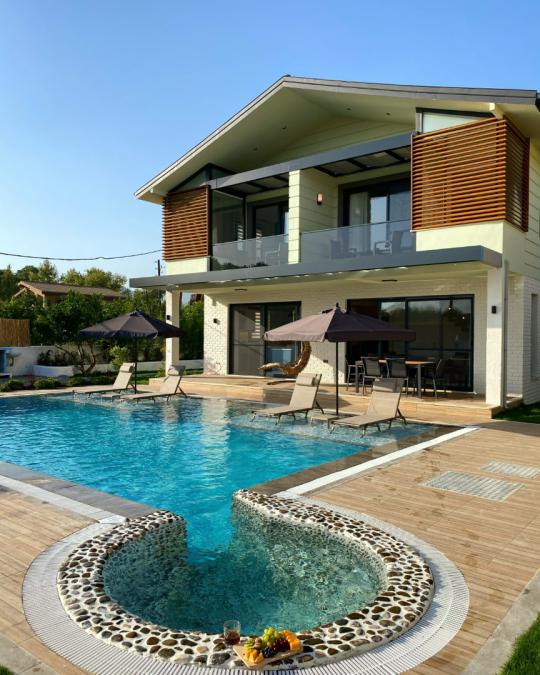 Düzenli bahçe peyzajı, özel havuz dizaynı ve jakuzili havuzu ile gününüzü bol oksijenin içinde güneşe tam anlamıyla doyacağınız özel bir tatil imkanı vadeden villamızın iç mekanı da oldukça modern, konforlu ve ferah bir yapıya sahiptir. Her iki yatak odası da ebeveyn banyosuna sahip villamızın yine her iki odasında jakuzi yer almaktadır.