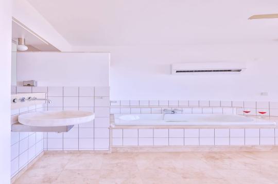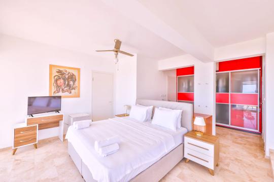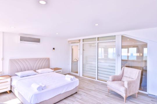 1. Yatak Odası: 1 çift kişilik yatak, elbise dolabı, komidin, klima, banyo, küvet, teras ve saç kurutma makinesi bulunmaktadır.