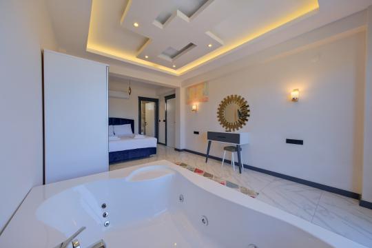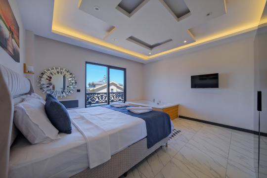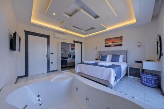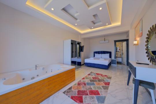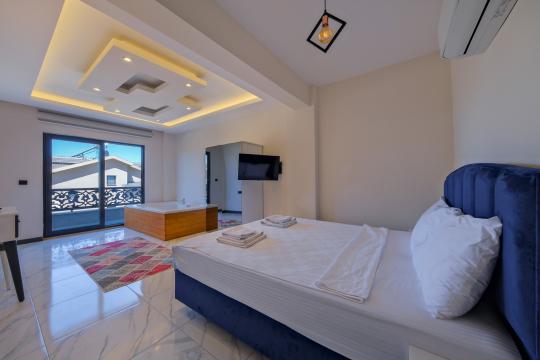 1. Yatak Odası : Çift kişilik yatak, komodin, makyaj masası, TV, klima, elbise dolabı, jakuzi, balkon, banyo ve tuvalet bulunmaktadır.