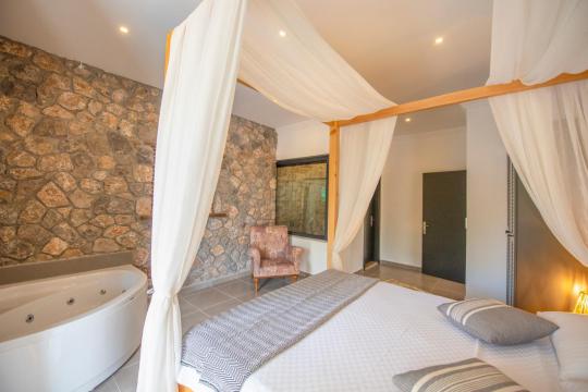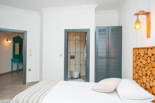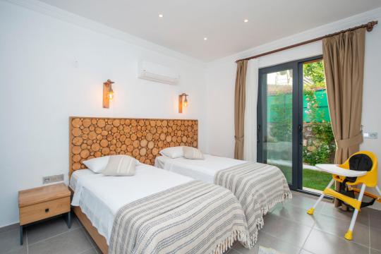 Kaliteli ve zevkli donanıma sahip olan evimiz 2 yatak odalı ve 4 kişi kapasitesine sahiptir. Birinci yatak odasında 1 adet çift kişilik yatak, ebeveyn banyosu, jakuzi, klima ve TV yer alırken ikinci yatak odasında 2 adet tek kişilik yatak, ebeveyn banyosu, klima ve TV bulunmaktadır. Ortak alanda açık mutfak salon, klima, TV ve WC yer almaktadır.