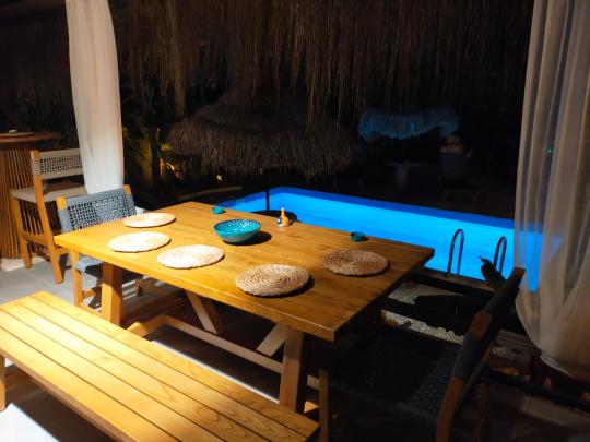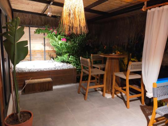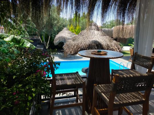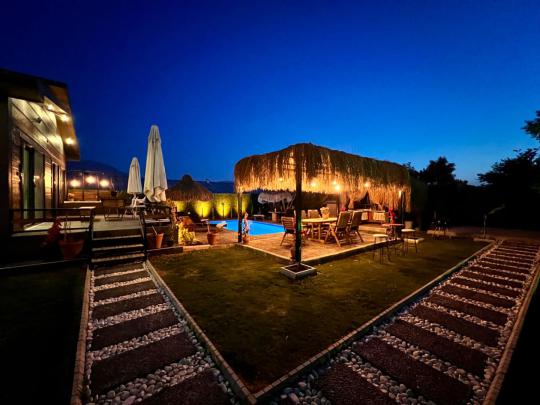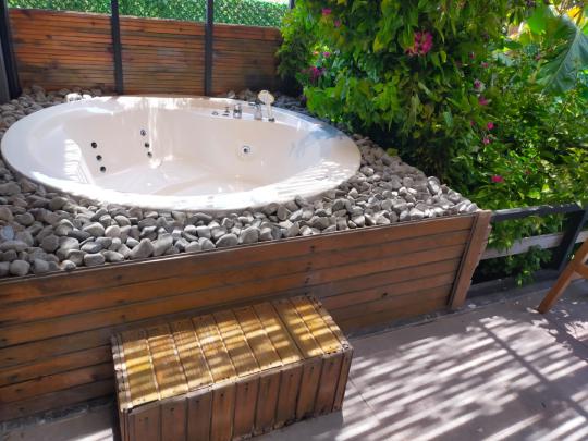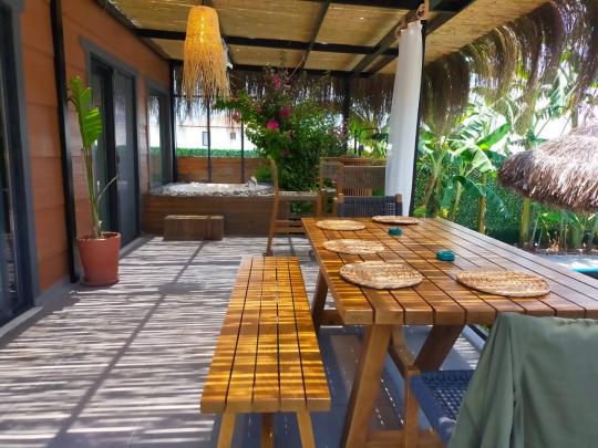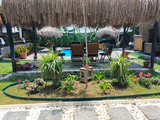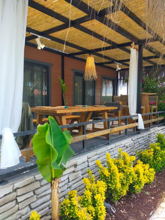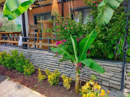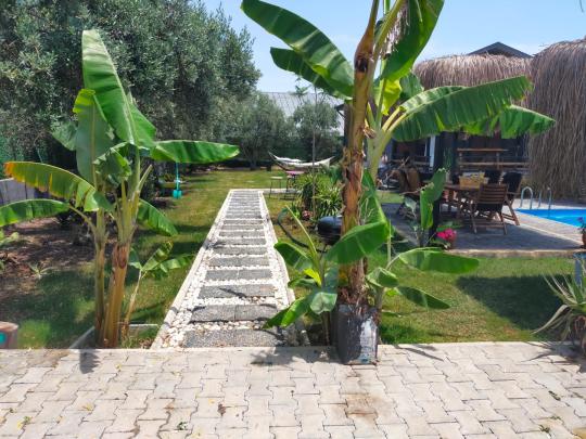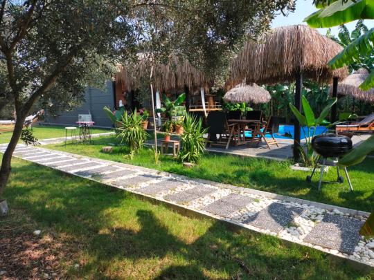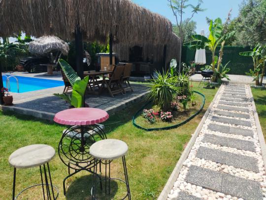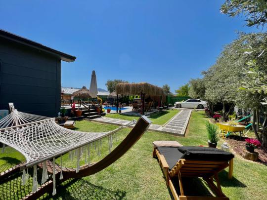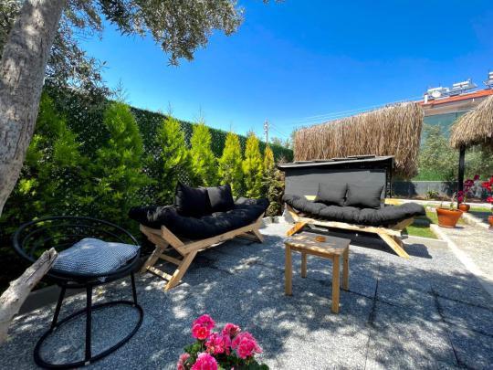 Bahçe : Özel bahçe içerisinde; bahçe oturma grubu, yemek masası & sandalyeler, şezlong, şemsiye, hamak ve jakuzi bulunmaktadır.