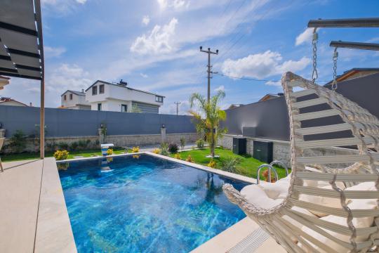 Bahçe : Yemyeşil bahçe içerisinde havuz ve şezlong, güneş şemsiyesi, sandalyeler, bahçe oturma grubu, langırt ve mangal yer almaktadır.