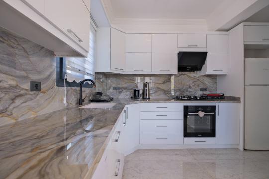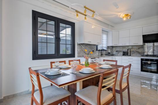 Mutfak : Modern Amerikan mutfak içerisinde buzdolabı, bulaşık makinesi, ankastre fırın, 4’lü ocak seti, su ısıtıcısı(kettle), mutfak gereçleri(tencere, tava, bardak, tabak vb.), yemek masası ve havuz bölümüne direkt çıkış yer almaktadır.