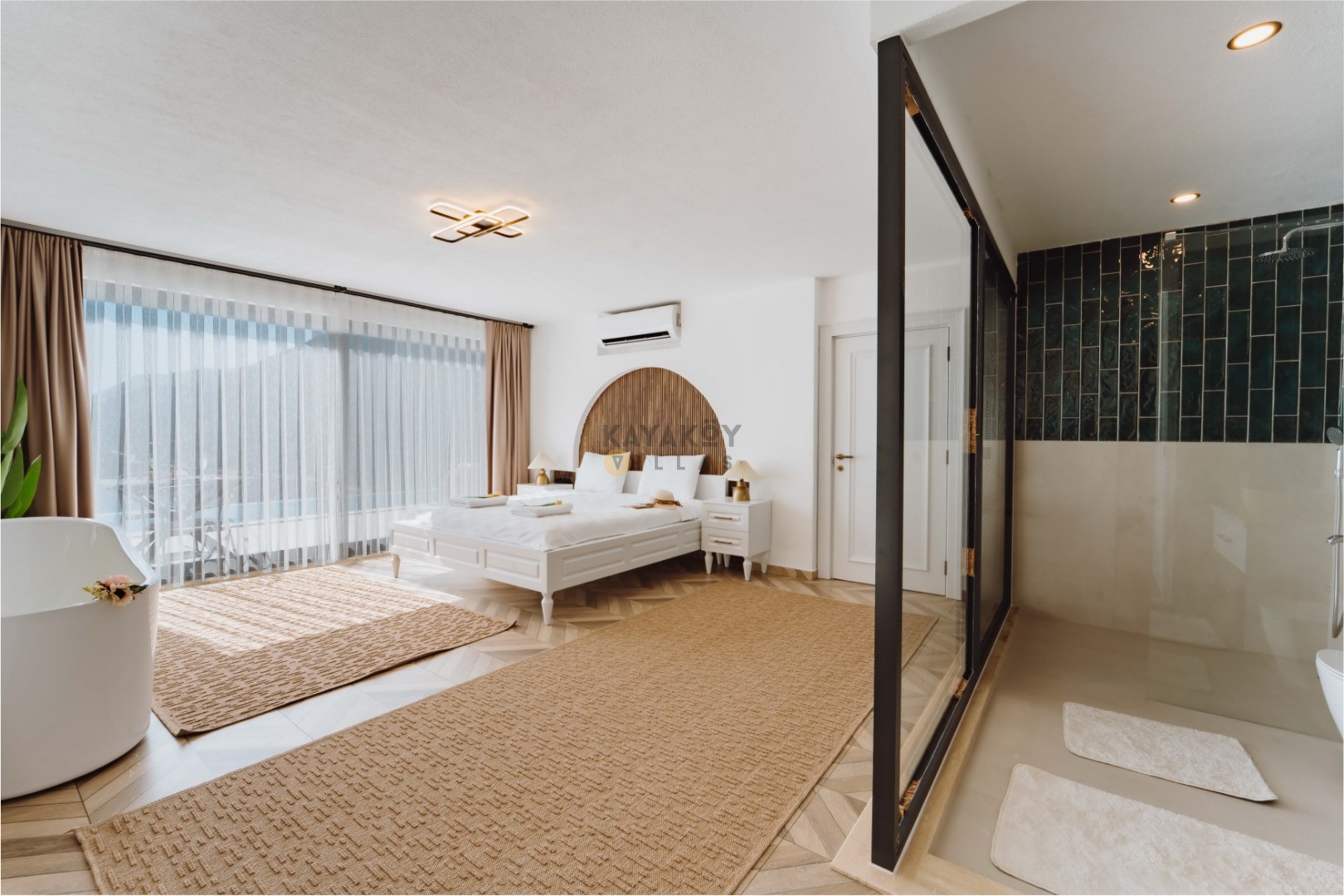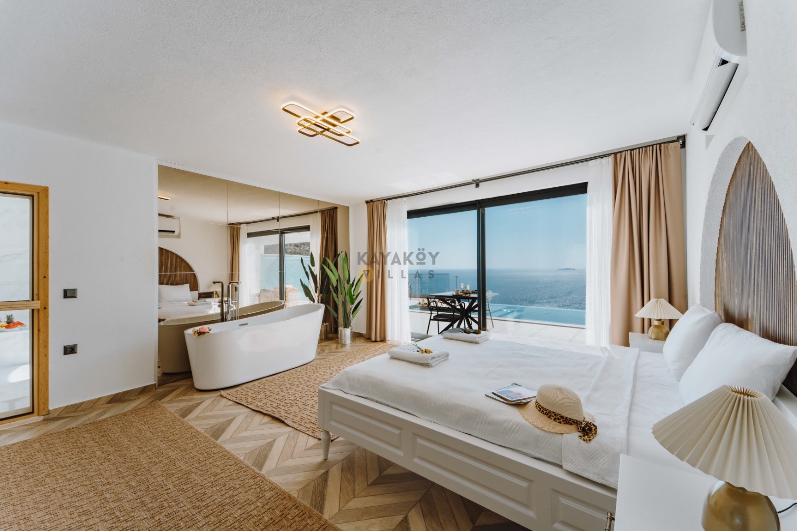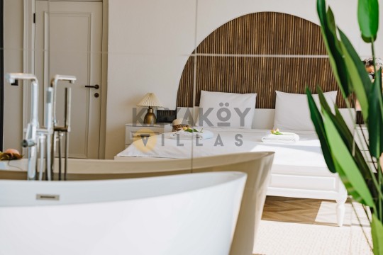 Jakuzili & Romantik Konsept: Villa Seraph’da jakuzili yatak odası ile balayı gibi özel tatiller için ideal konfor.