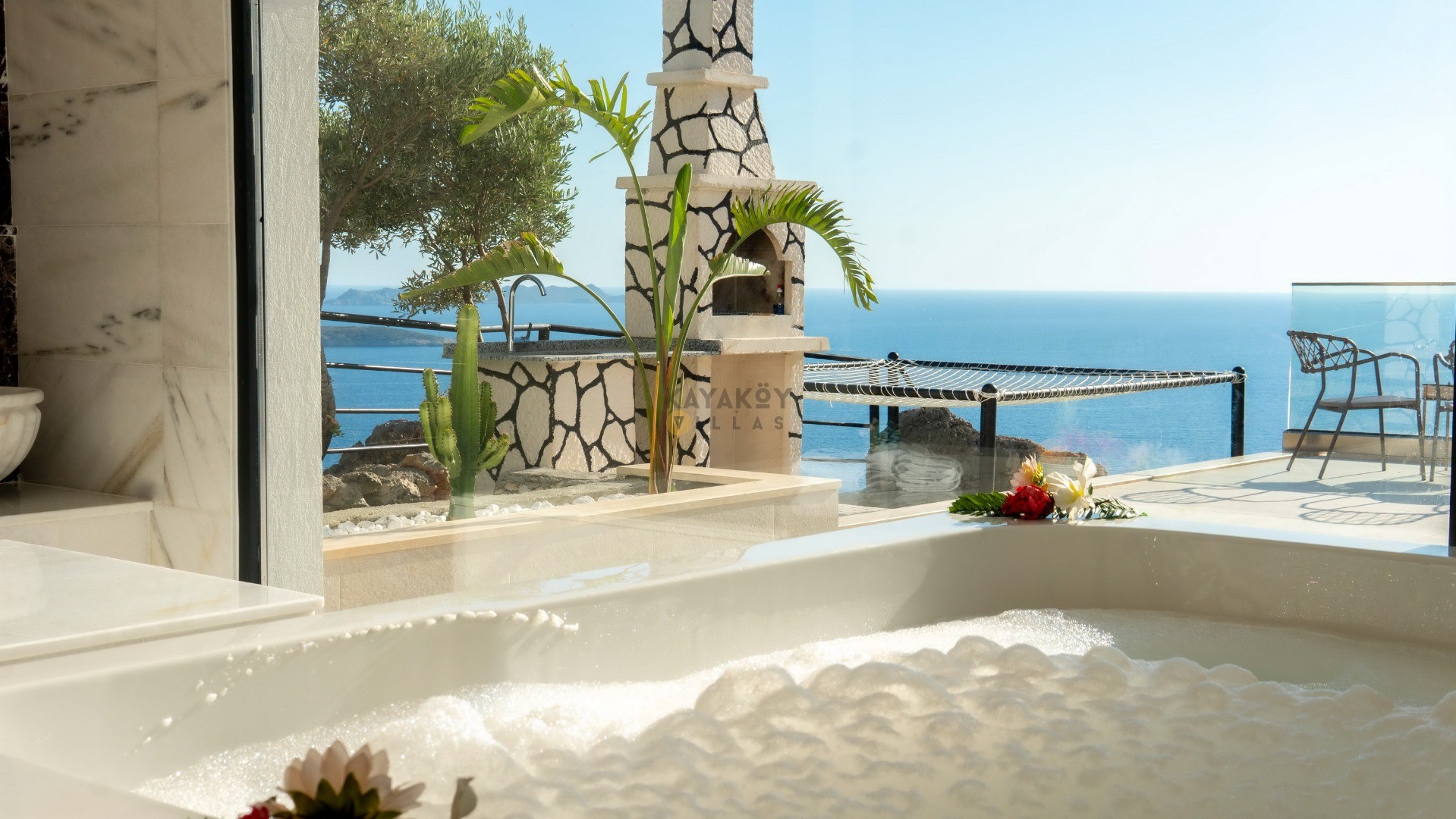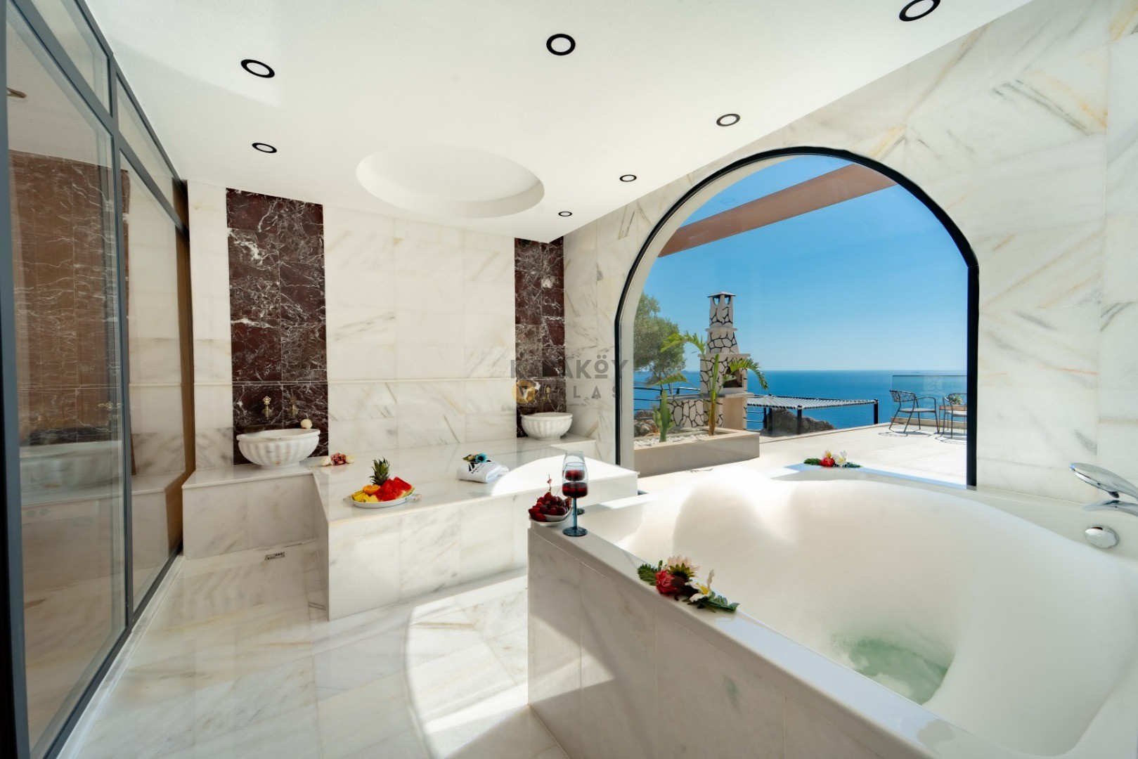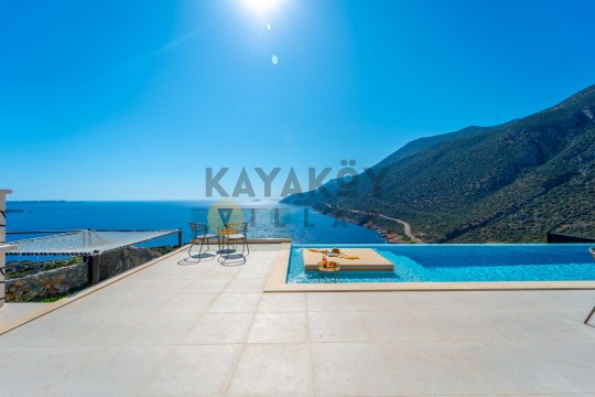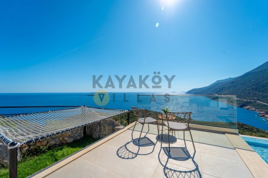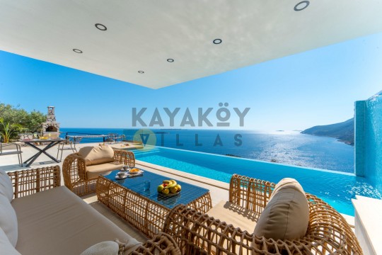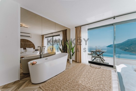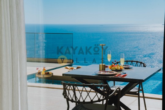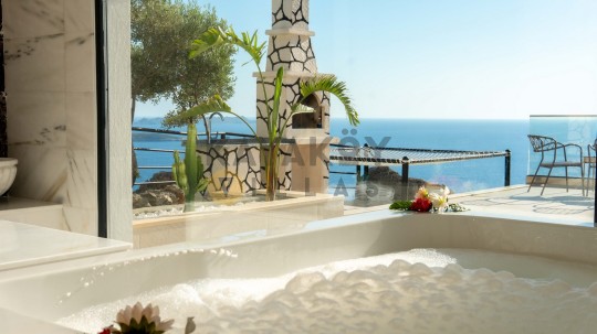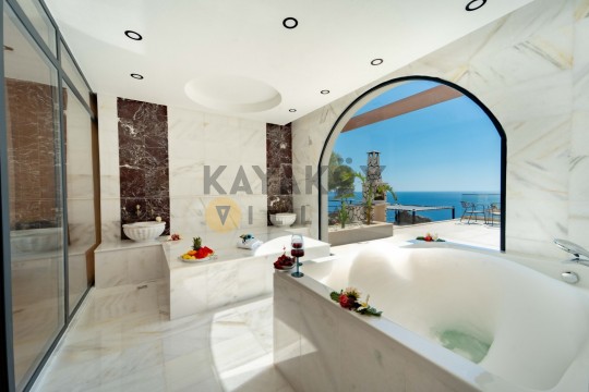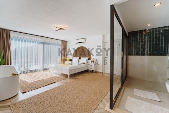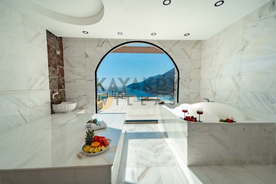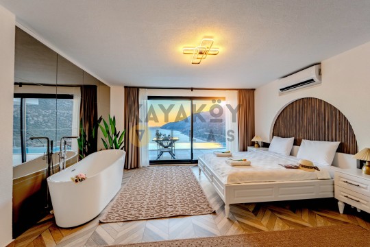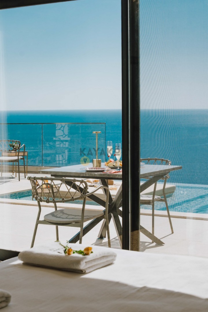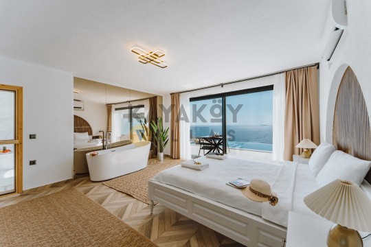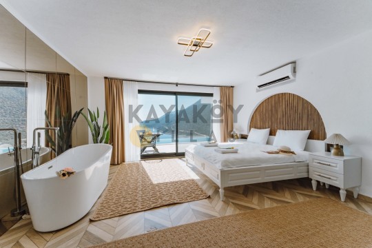 Villa Seraph’ın dış mekânında tamamen size ait özel yüzme havuzu ve geniş teras alanı bulunur; havuz çevresinde şezlonglar, yemek masası ve oturma grubu ile gün boyunca dış mekân keyfi yapabilirsiniz. Villanın panoramik deniz ve doğa manzarası, Akdeniz’in huzur dolu atmosferiyle birleşerek unutulmaz bir tatil ortamı sunar. Ayrıca villa içerisinde jakuzili ve spa alanı gibi lüks detaylar yer alır; bu da Villa Seraph’da konaklamayı daha özel hâle getirir.