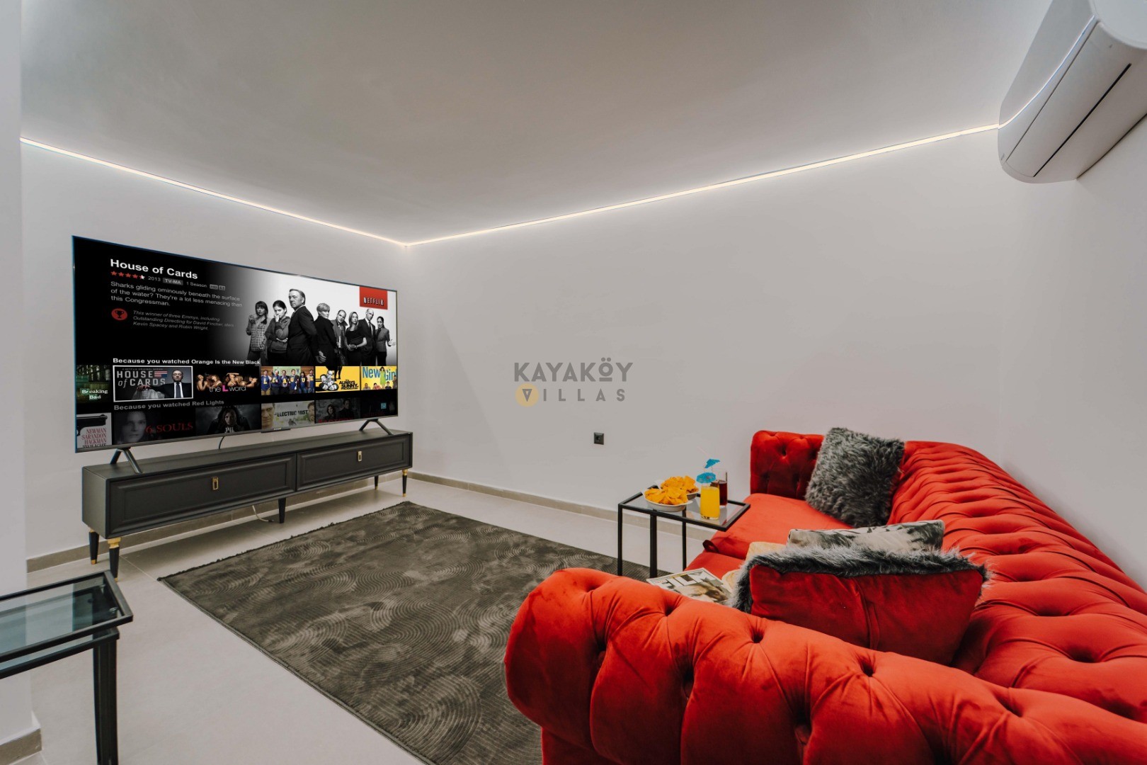 Modern ve Ferah İç Mekan: Konforlu salon, uydu TV, klima ve Wi-Fi ile donatılmış yaşam alanı.