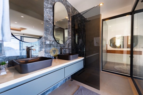 Villa Seraph Duo’nun dış mekânında tamamen size ait özel yüzme havuzu, geniş teras alanı, şezlonglar ve oturma grupları bulunur; bu alan sayesinde gün boyunca havuz keyfi yapabilir, sevdiklerinizle keyifli vakit geçirebilirsiniz. Villanın çevresi, Akdeniz’in huzur veren doğası ve panoramik manzarasıyla iç içe bir tatil atmosferi sunar. Ayrıca villa içerisinde jakuzili banyo imkânı gibi ekstra detaylar yer alır; bu da Villa Seraph Duo’da konaklamayı daha ayrıcalıklı hâle getirir.