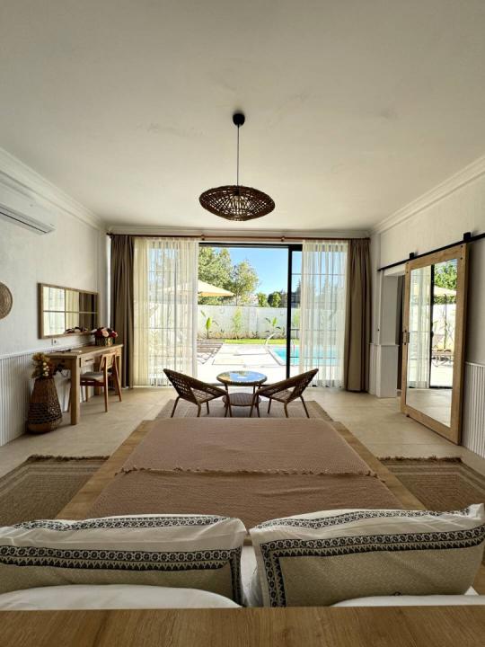 Villamızın içerisinde 2 yatak odası ve 2 WC-Duş mevcuttur. Birinci yatak odası içerisinde bir çift kişilik yatak, WC Duş ve klima mevcuttur. İkinci yatak odası içerisinde bir adet çift kişilik yatak ve klima bulunmaktadır. Ortak alanda ise klima, TV, salon - mutfak ve 1 kişilik yatma imkanı bulunmaktadır. Ayrıca villamızın havuz başında küvet bulunmaktadır.