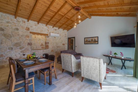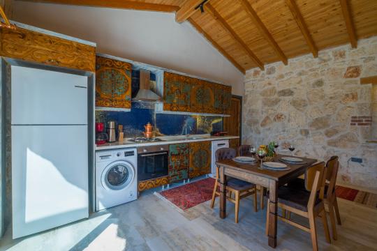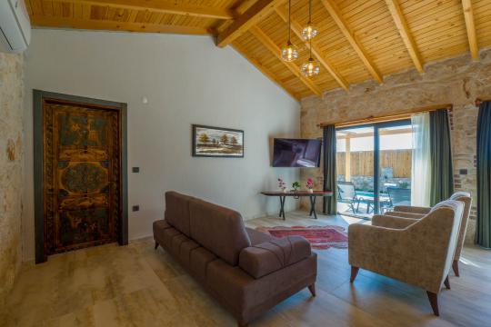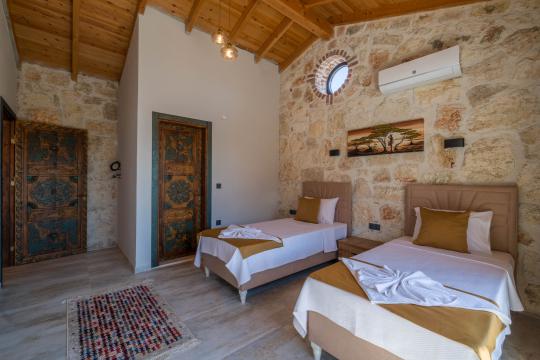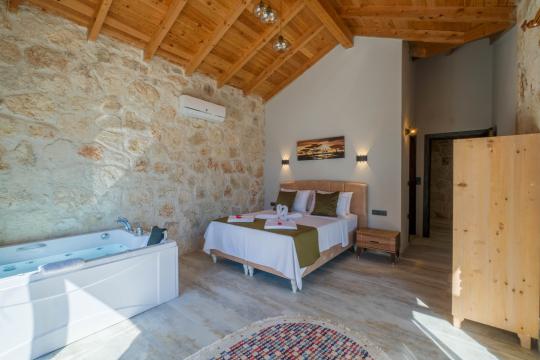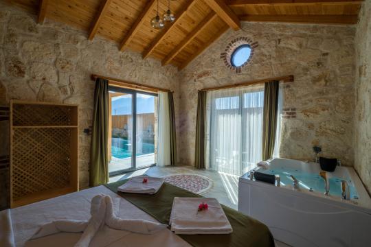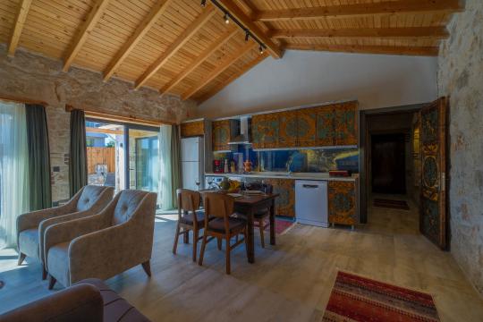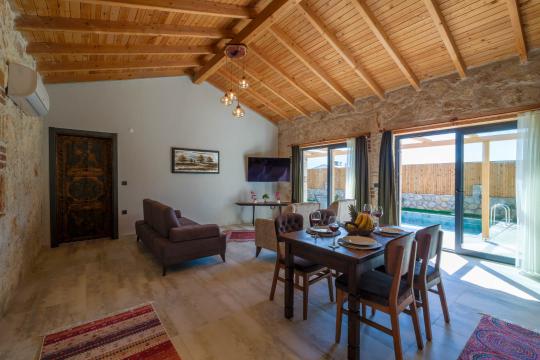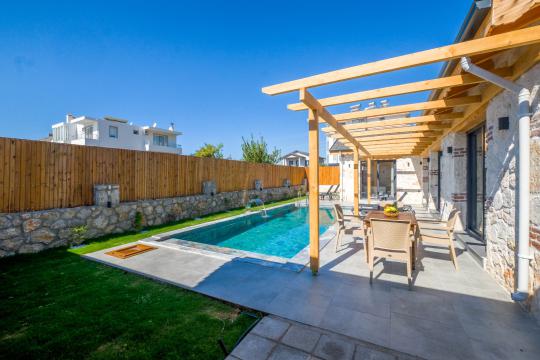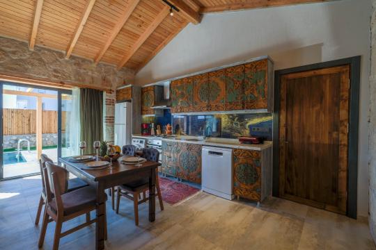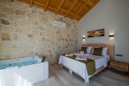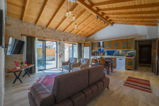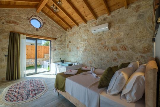Fethiye'nin muhteşem doğasında, sakinliği ve konforu bir araya getiren özel bir tatil deneyimi sizi bekliyor. Doğanın içinde bulunan villamızda, özel bahçesi ve havuzuyla keyifli vakit geçirebilir ve doğanın tadını çıkarabilirsiniz. Yine havuz terasına açılan konforlu oturma odası ve açık mutfağı; bir yatak odasında çift kişilik yatak, jakuzi ve banyo, bir yatak odasında ise iki tek kişilik yatak ve banyo bulunmaktadır.