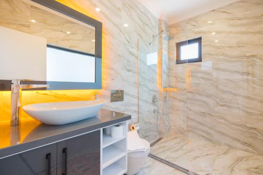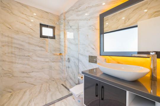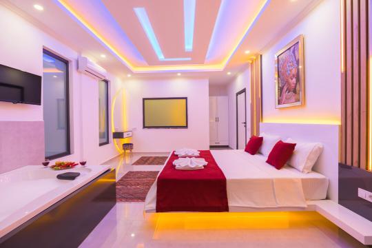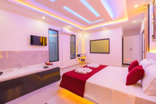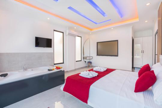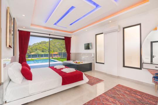 1.Yatak Odası: 1 adet çift kişilik yatak, klima, elbise dolabı, komodin, makyaj masası, jakuzi, banyo, tuvalet ve küçük bir oturma alanı ve havuz terasına çıkış bulunmaktadır.