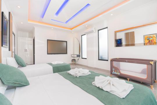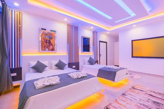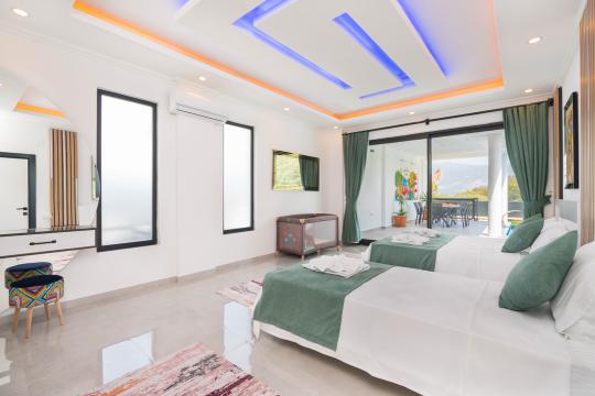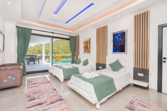 2.Yatak Odası: 1 adet çift kişilik yatak, 1 adet tek kişilik yatak, klima, elbise dolabı, komodin, makyaj masası, banyo, tuvalet, havuz terasına çıkış bulunmaktadır.