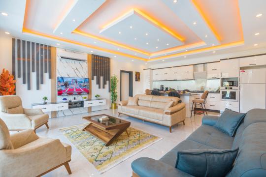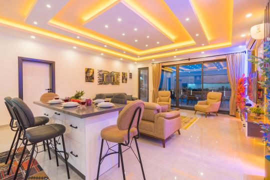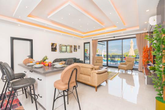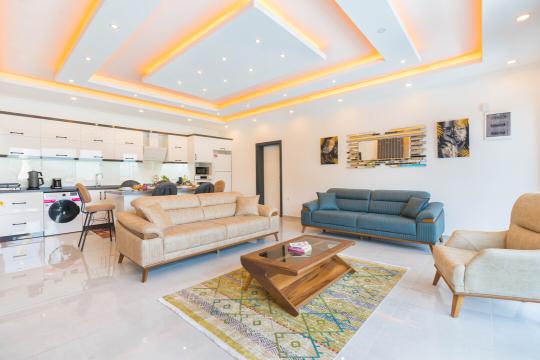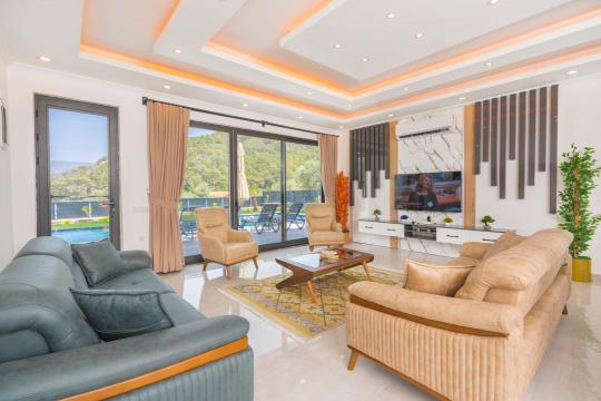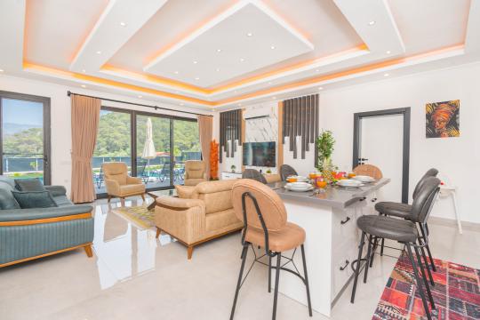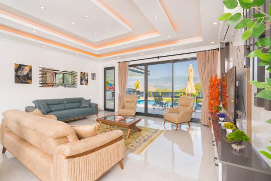Şık dekore edilmiş salonda, oturma grubu, televizyon, uydu alıcı ve klima yer almaktadır. Ayrıca salondan havuz terasına çıkışta bulunmaktadır.
