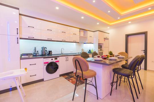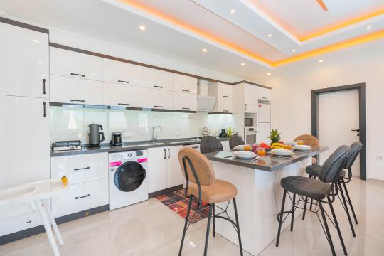 Modern mutfakta, bulaşık makinesi, çamaşır makinesi, mikrodalga fırın, 4’lü ocak, fırın, buzdolabı, kettle, tost makinesi, tencere ve tava takımı, 6 kişilik yemek takımı, kaşık ve çatal seti, bardaklar ve havuz terasına çıkış bulunmaktadır.