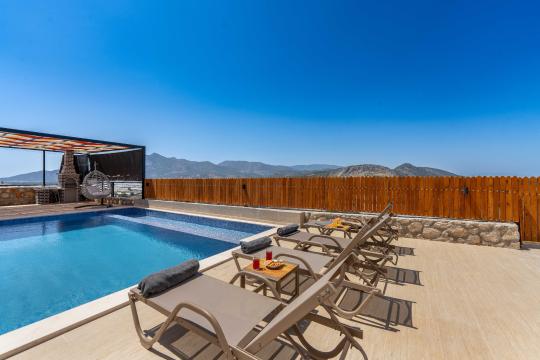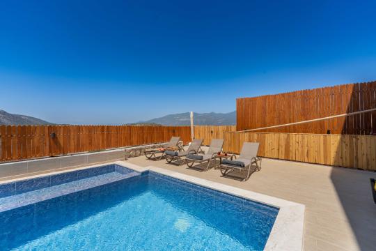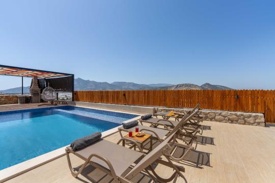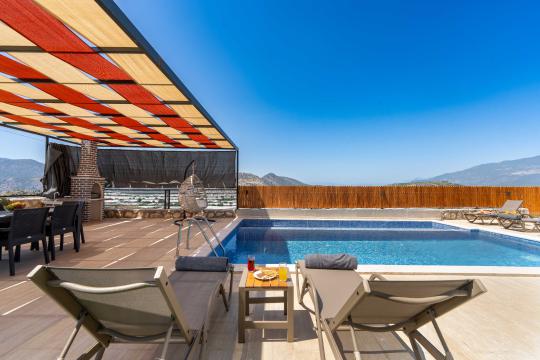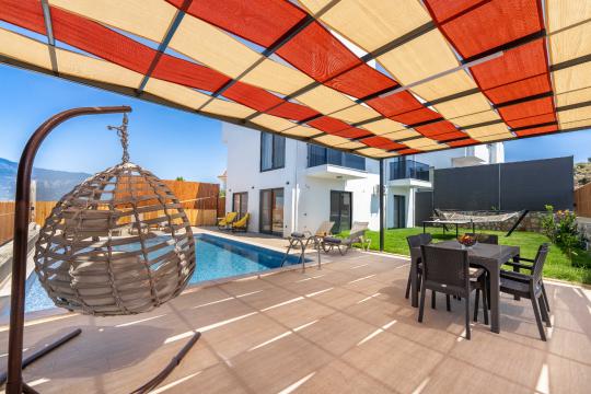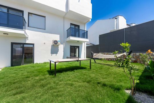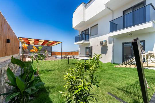 Villanın kendine ait özel yüzme havuzu, dışarıdan görünmeyecek şekilde konumlandırılmış olup gün boyu kesintisiz bir mahremiyet sağlamaktadır. Geniş ve ferah bahçesinde yer alan barbekü alanı, akşam yemeklerinizi açık havada keyifle hazırlamanız için düşünülmüştür.