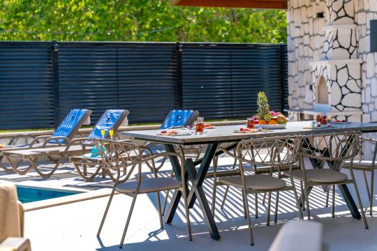Doğa içinde bulunan villada kapasiteye uygun oturma alanı, şezlong takımı, barbekü alanı; havuz terasına açılan konforlu oturma odası, ihtiyaçlarınızı karşılayacak donanımlı mutfağı bulunmaktadır.