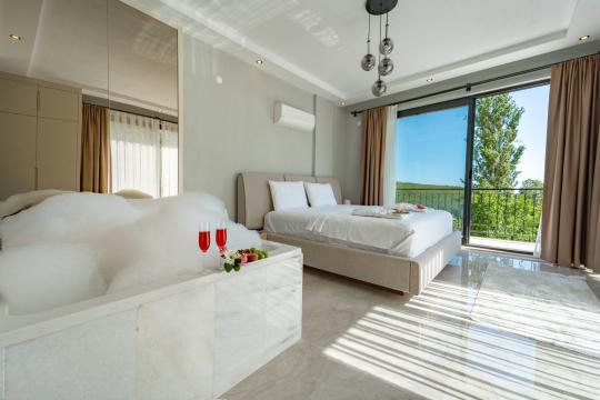 1. yatak odasında Çift Kişilik Yatak, Jakuzi, Banyo/WC, 2 Komodin, Elbise dolabı, Makyaj Masası, Klima