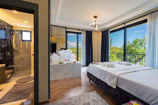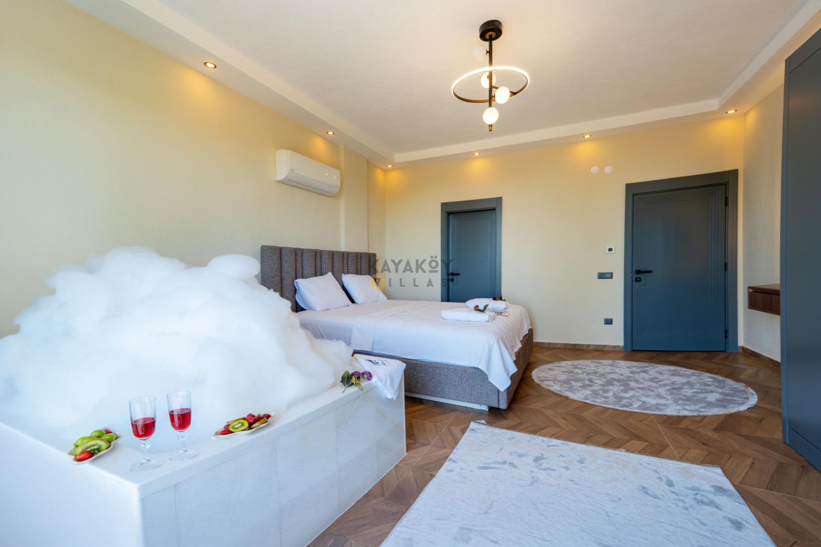1. yatak odasında Çift Kişilik Yatak, Jakuzi, Banyo/WC, 2 Komodin, Elbise dolabı, Makyaj Masası, Klima
