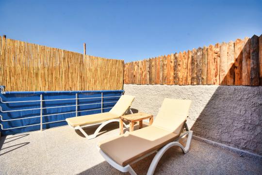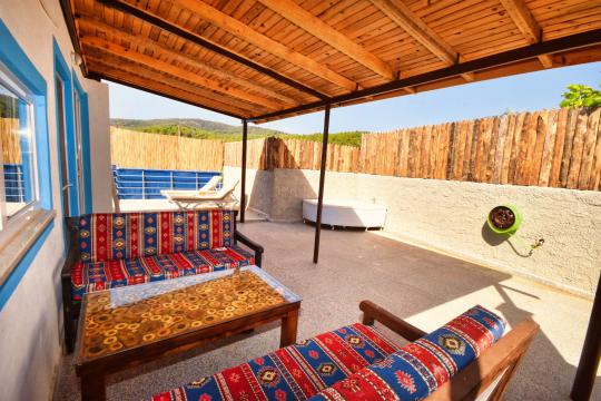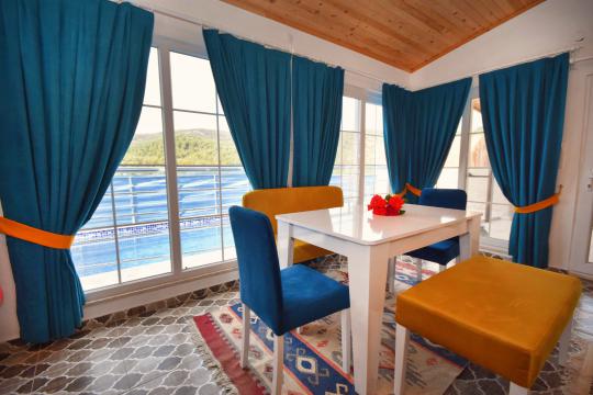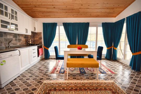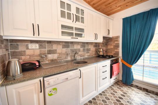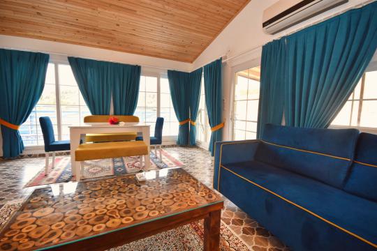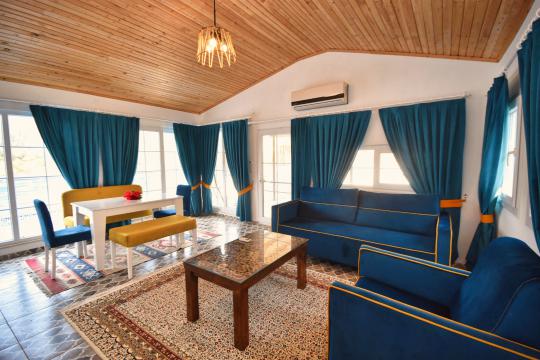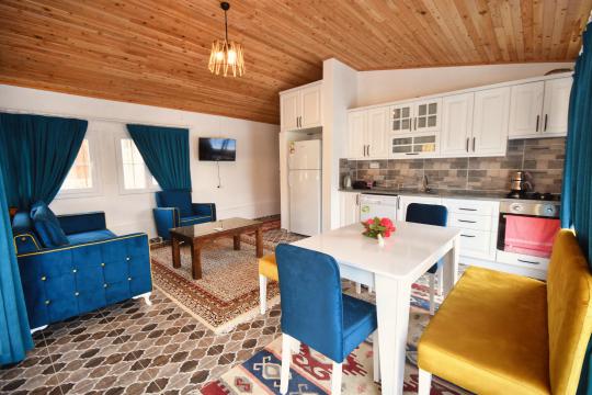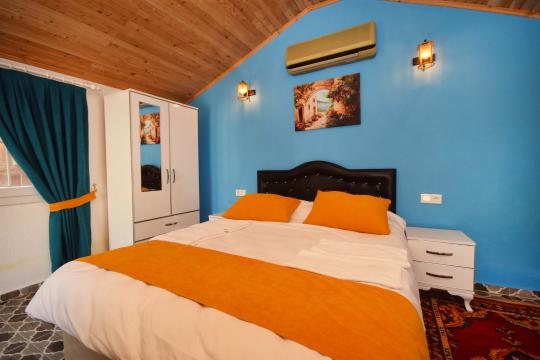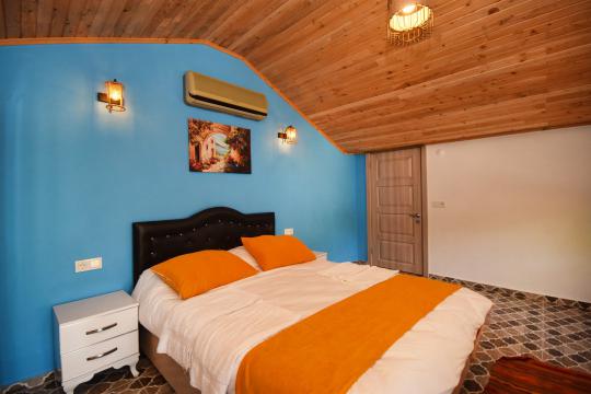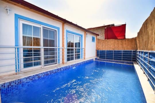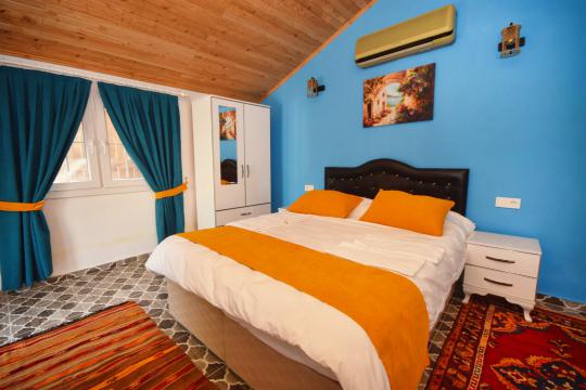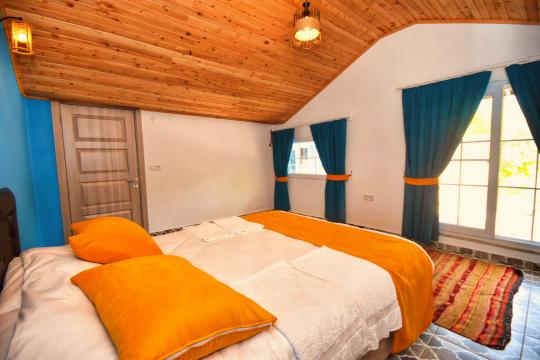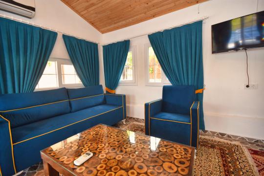 Villamızın içerisinde bir adet yatak odası bulunmaktadır, yatak odası içerisinde bir adet çift kişilik yatak ve klima yer almaktadır. Ortak alanda ise açık mutfak - salon, WC-Duş, TV ve klima mevcuttur