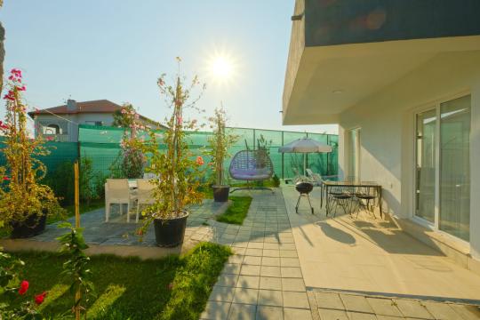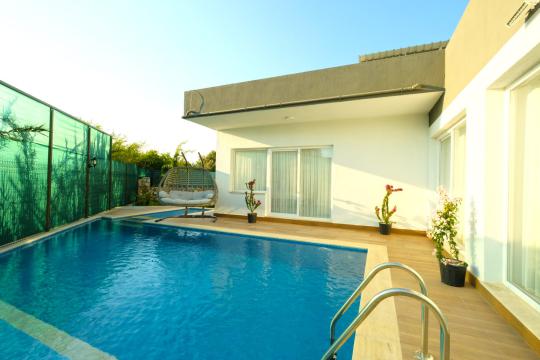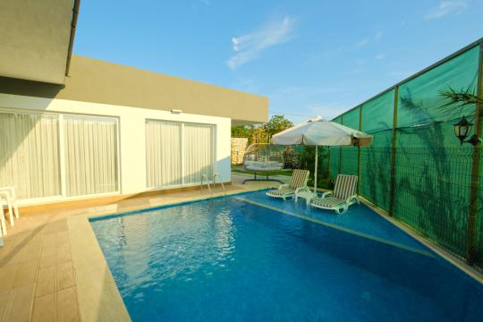 Bahçe : Bahçe içerisinde şezlong, havuz, çocuk havuzu, salıncak, yemek masası, güneş şemsiyesi, barbekü bulunmaktadır.