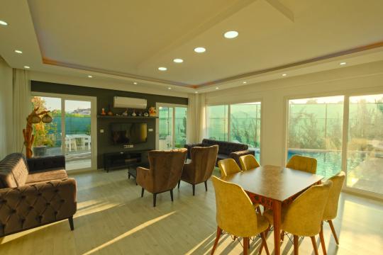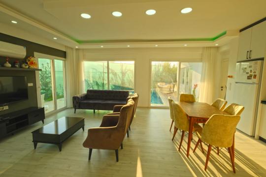 Salon : Salon içerisinde şık bir oturma grubu, sehpa, TV, klima ve havuz terasına çıkış bulunmaktadır.