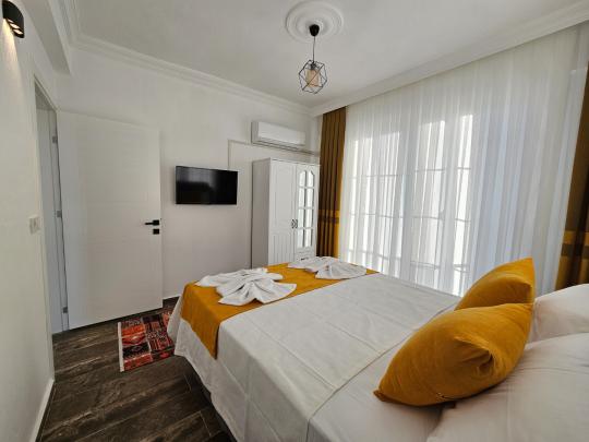İkinci yatak odası içerisinde bir adet çift kişilik yatak, TV ve klima,