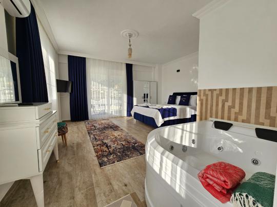 Birinci yatak odası içerisinde bir çift kişilik yatak, ebeveyn banyosu, jakuzi, TV ve klima,